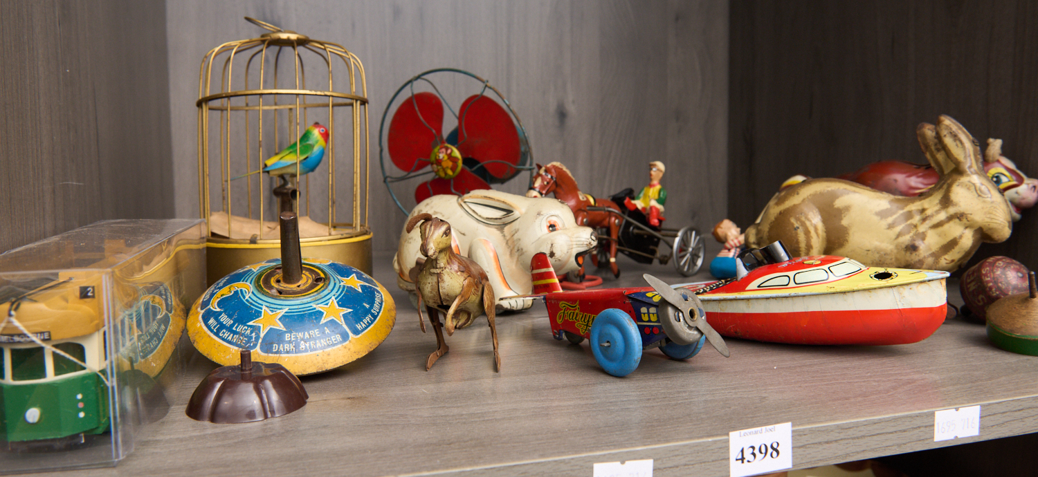 SHELF OF WIND UP METAL TOYS, LEONARD JOEL LOCAL DELIVERY SIZE: SMALL. The Rodney Permezel Collection