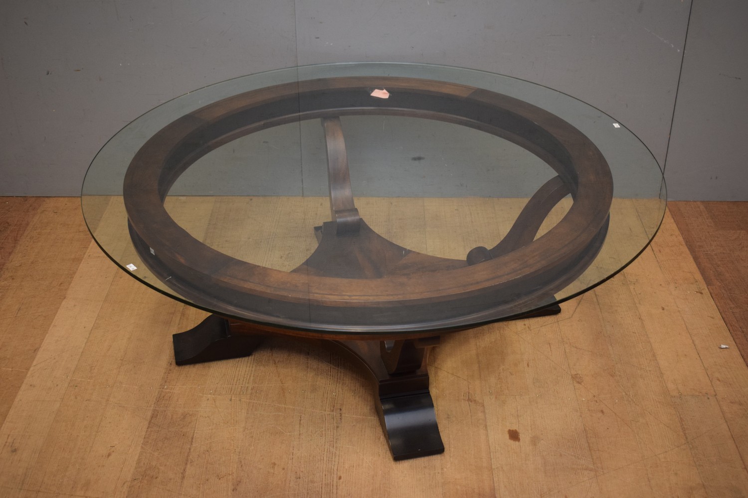 A LARGE CIRCULAR ART DECO STYLE COFFE TABLE WITH GLASS TOP (H46 X D130 CM) (PLEASE NOTE THIS HEAVY ITEM MUST BE REMOVED BY CARRIERS AT THE CUSTOMER'S EXPENSE. LEONARD JOEL STAFF CANNOT ASSIST CARRYING THIS ITEM) (X-LARGE ITEM)