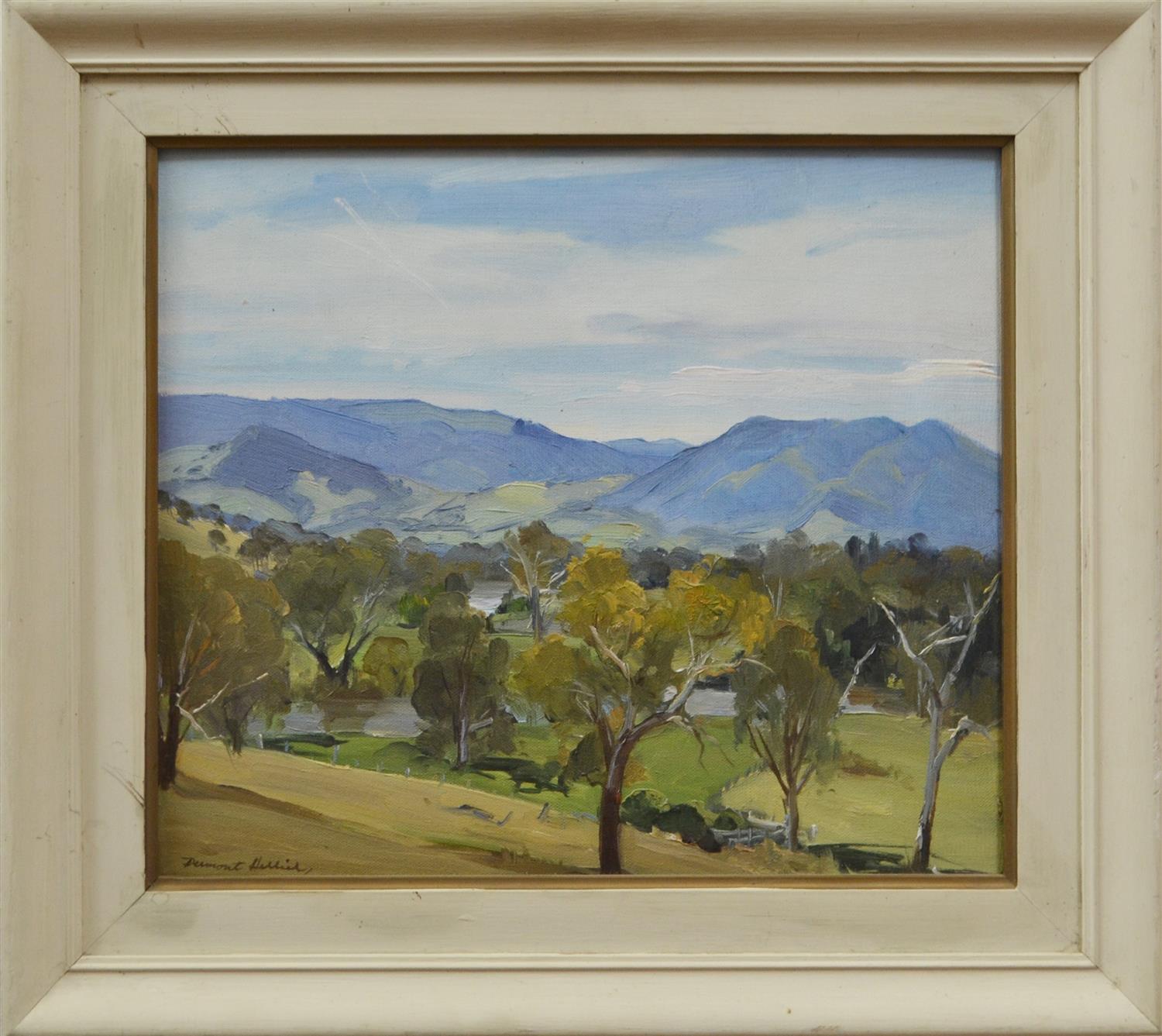 DERMONT HELLIER, THE VALLEY TUMUT, OIL ON BOARD, 29 X 34CM