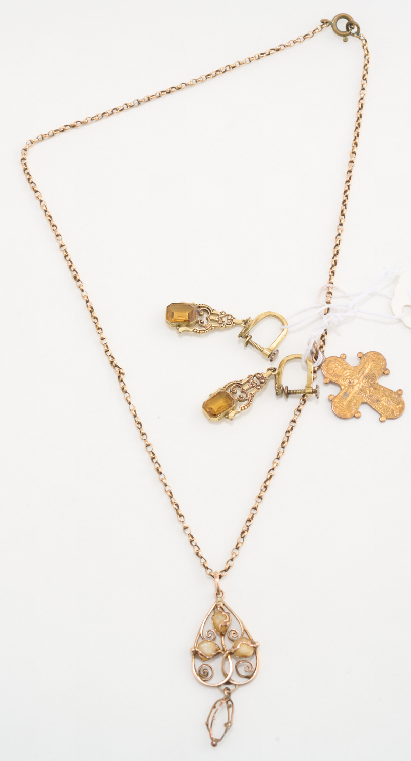 A COLLECTION OF GOLD JEWELLERY, COMPRISING A CULTURED PEARL PENDANT IN 9CT GOLD, TO A CHAIN IN 14CT GOLD, A PAIR OF PASTE SET DROP EARRINGS IN LOW CARAT GOLD AND A CROSS PENDANT, A/F, TOTAL WEIGHT 11.5GMS
