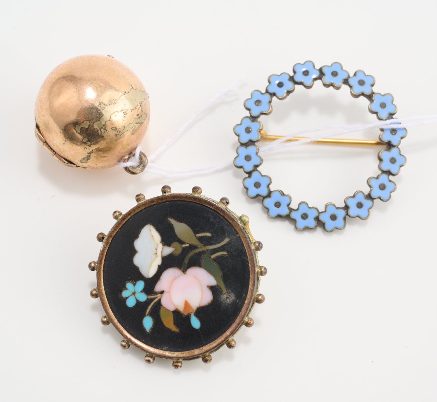 A PIETRA DURA BROOCH INSCRIBED 1896, TOGETHER WITH A BLUE FLOWER BROOCH AND ANTIQUE MOURNING LOCKET, PLATED IN 11CT GOLD (XRF TESTED)
