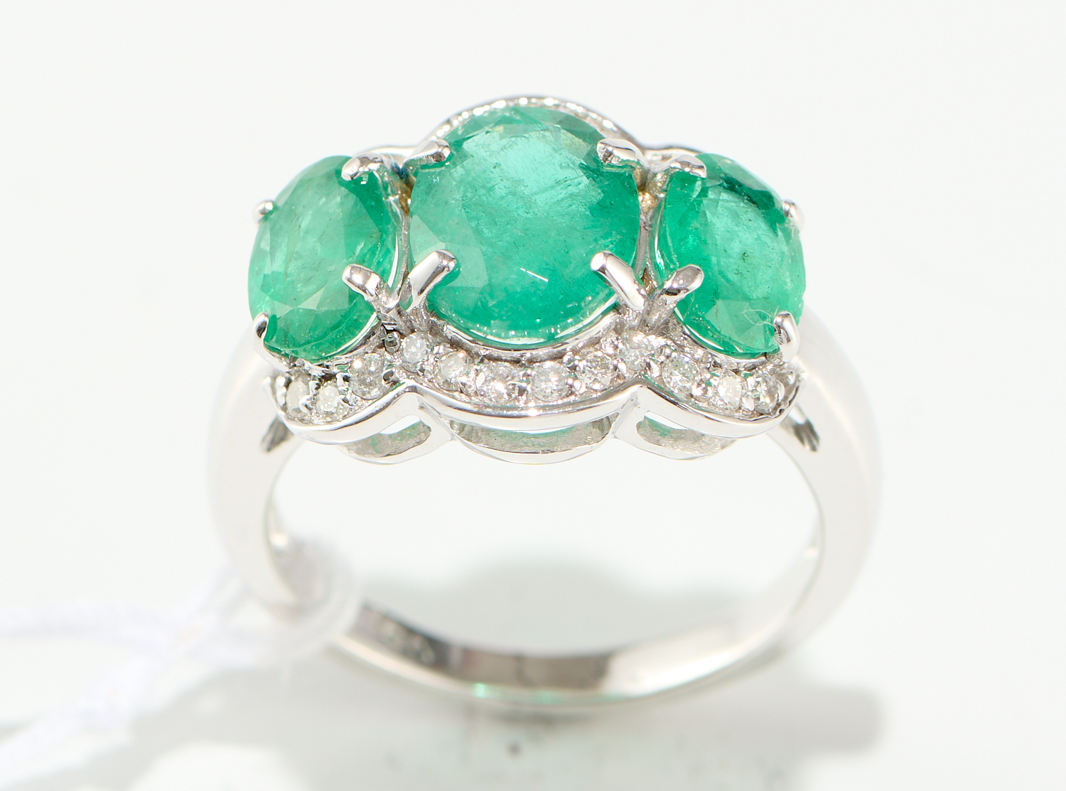 A DIAMOND AND EMERALD DRESS RING IN 18CT WHITE GOLD, EMERALDS TOTALLING 3.80CTS AND DIAMONDS TOTALLING 0.10CTS, RING SIZE L, 4.9GMS