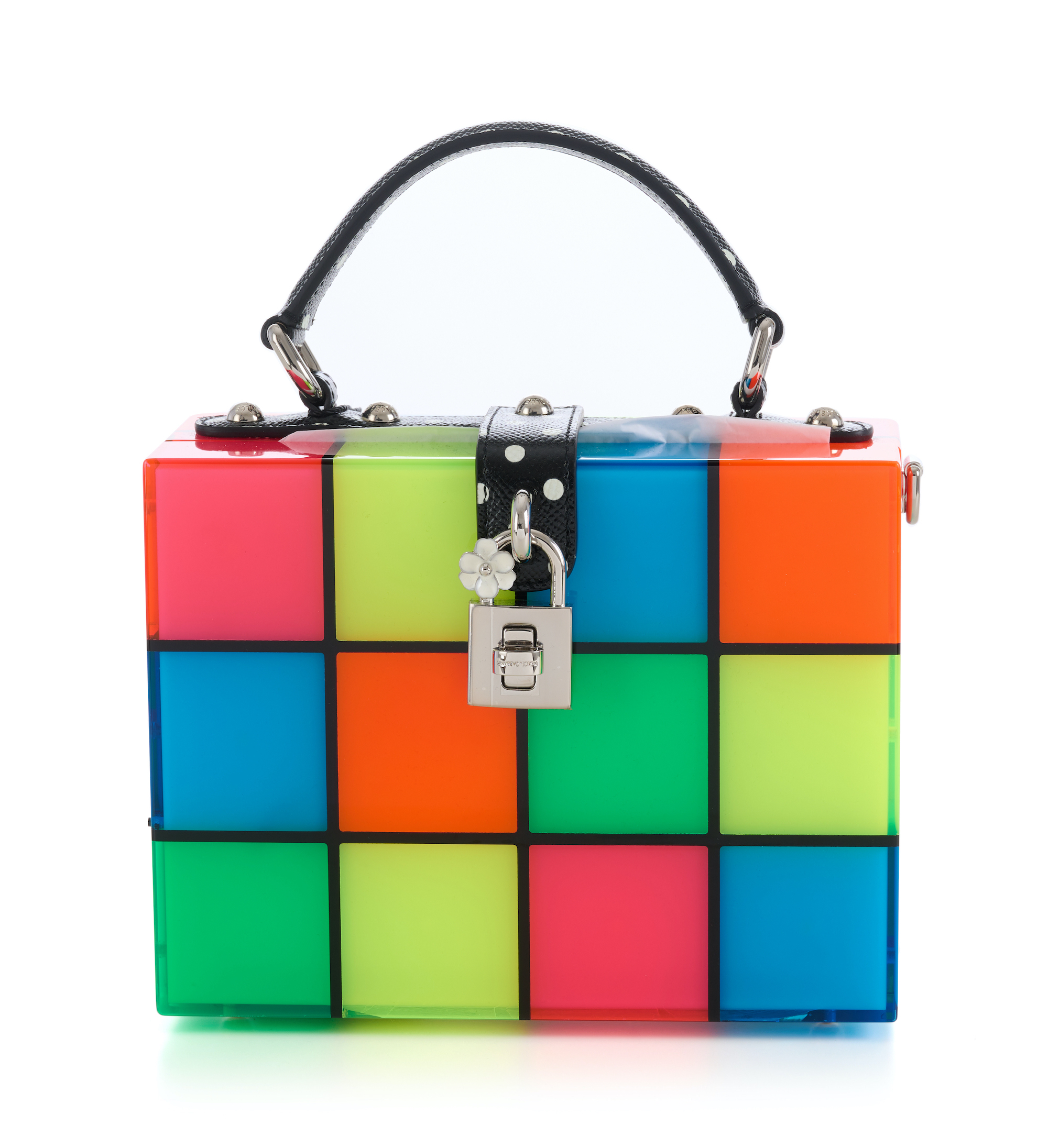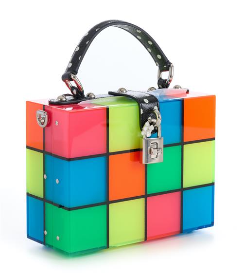 Styled in chequerboard multicoloured Plexiglass with black and white leather handle with polka dot print top handle, detachable leather shoulder strap and silver tone metal hardware, 19 x 15 x 6.5cm.
