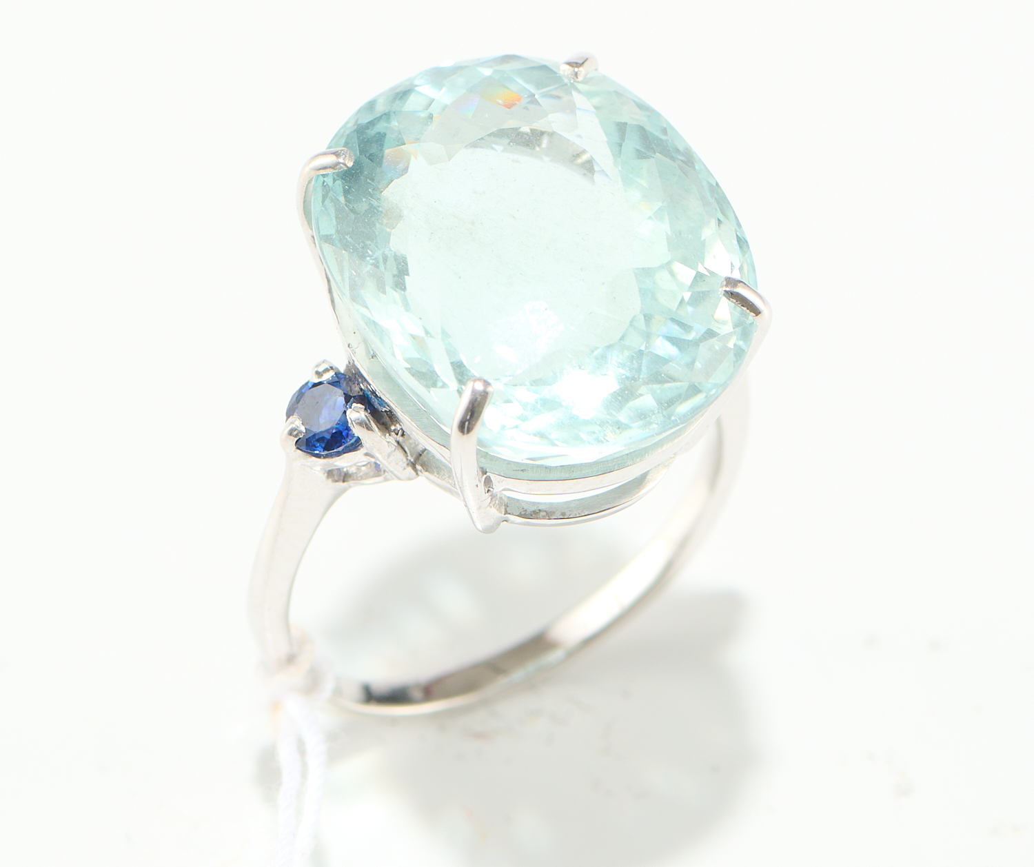 AN AQUAMARINE AND BLUE SAPPHIRE DRESS RING IN 18CT WHITE GOLD, THE AQUAMARINE WEIGHING 14.52CTS AND THE SAPPHIRES TOTALLING 0.38CTS, RING SIZE K, 5.8GMS