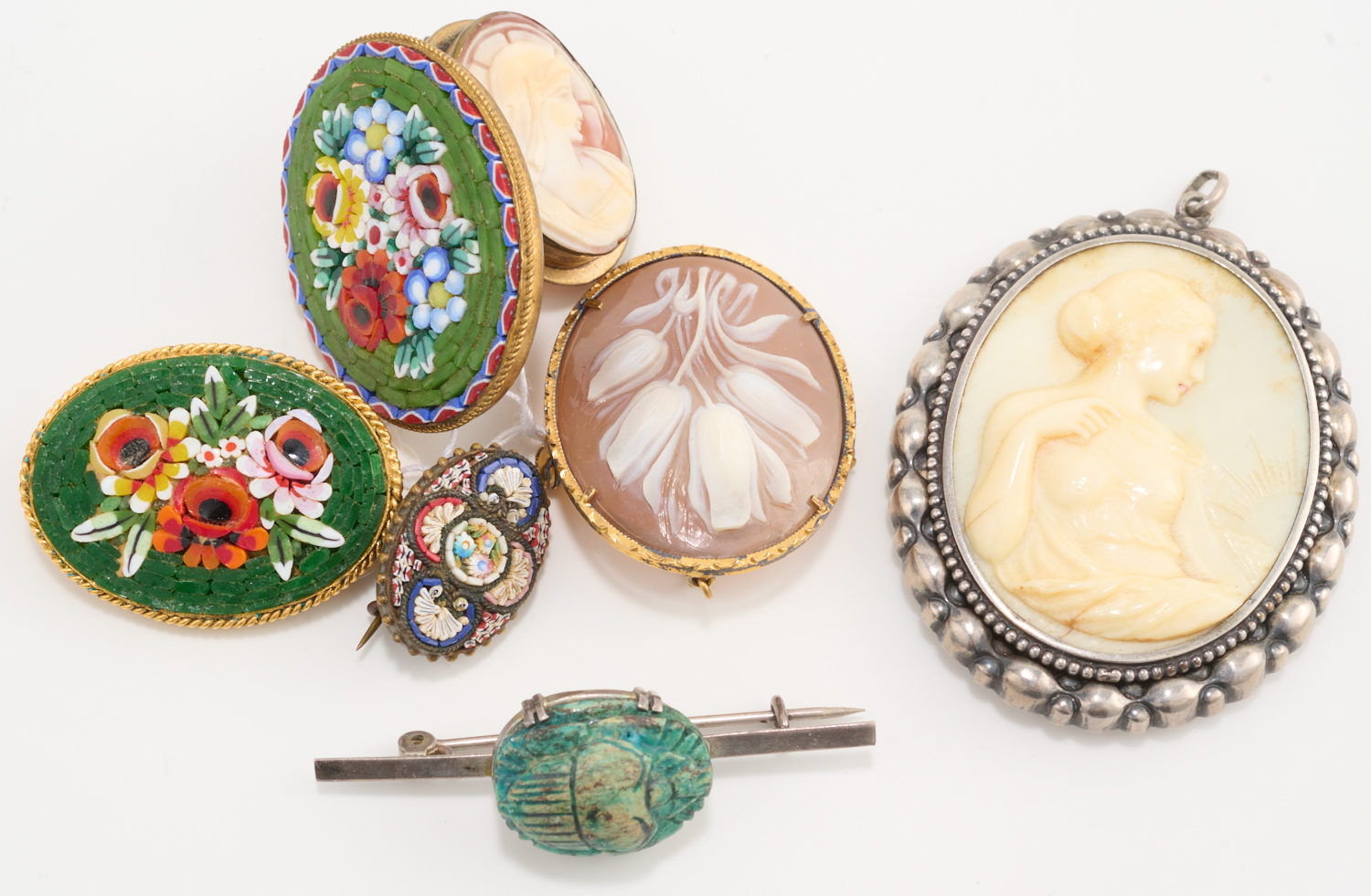 A COLLECTION OF BROOCHES AND PENDANTS, INCLUDING THREE MICROMOSAIC BROOCHES AND A CAMEO IN 9CT GOLD