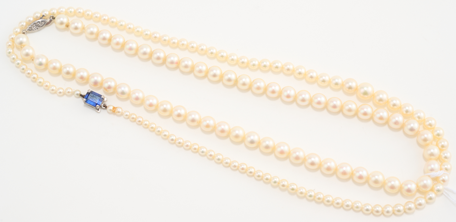 TWO STRANDS OF GRADUATED PEARLS, ONE TO A BLUE PASTE SET CLASP