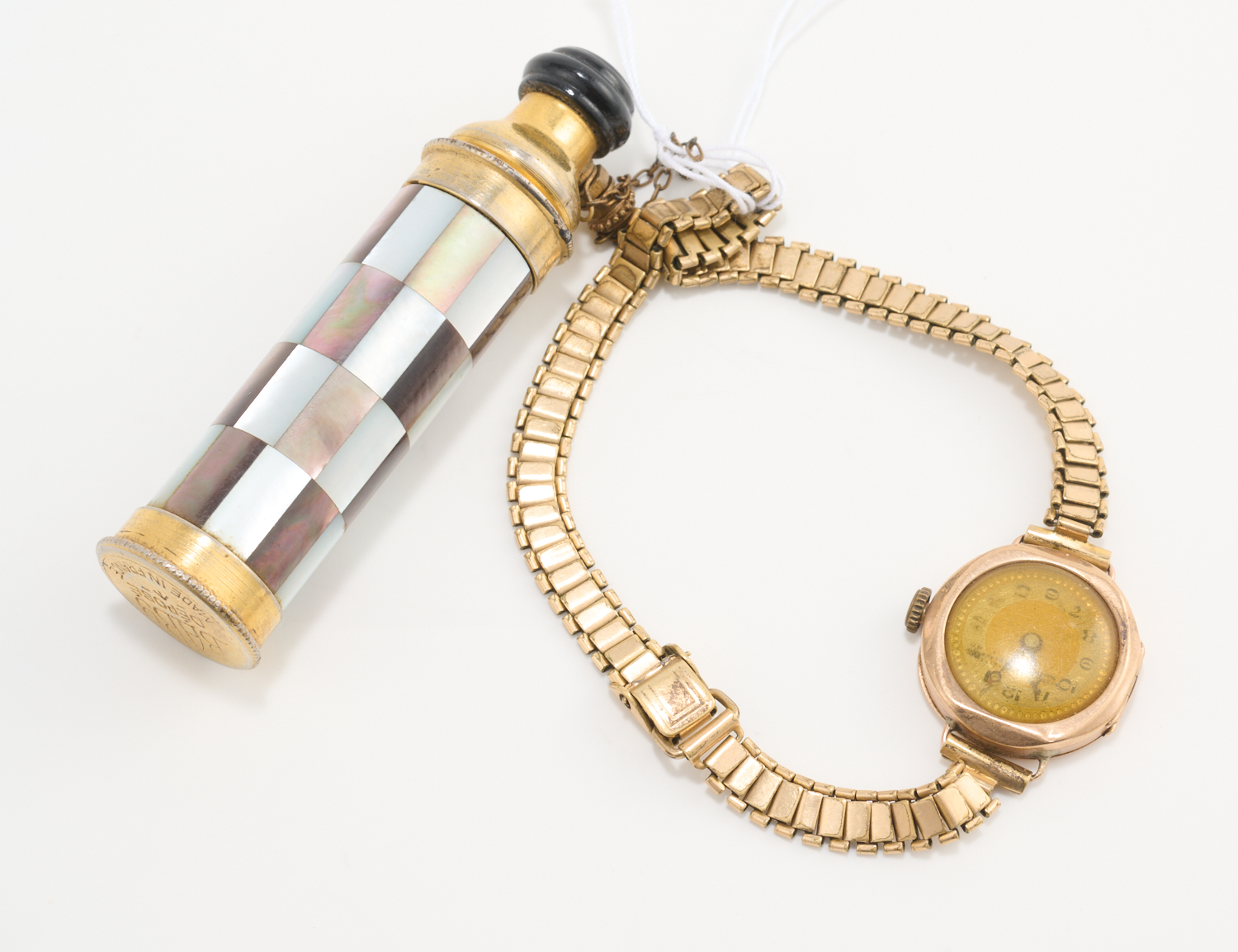 AN ANTIQUE WRISTWATCH, FACE IN LOW CARAT GOLD, ALONG WITH AN ANTIQUE ESSENTIAL OIL VESSEL SIGNED BABY DEPOSE, GOLD PLATED