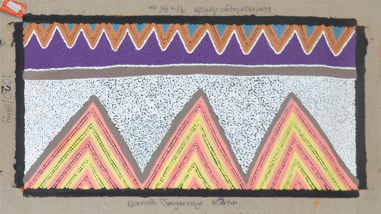 KENNETH JUNGARRAYI MARTIN, WAKULYARRI JUKURRPA (BLACK FOOTED WALLABY DREAMING), ACRYLIC ON CANVAS, 91 X 46CM (CAT. NO.1020/12NY), (UNSTRETCHED)