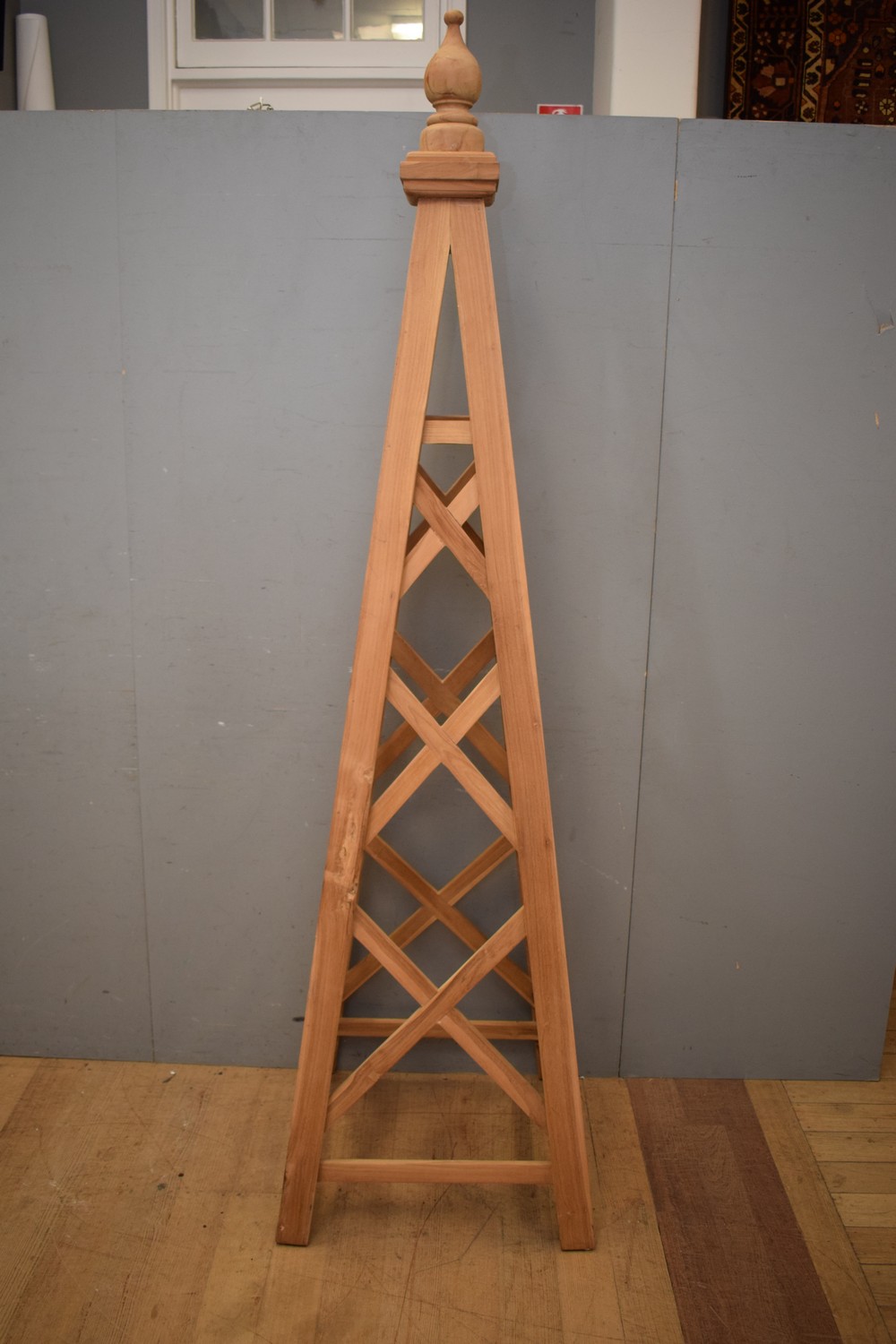 A LARGE TEAK GARDEN OBELISK ( A/F) ( 214H X 61W X 61D CM) (LEONARD JOEL DELIVERY SIZE: LARGE)