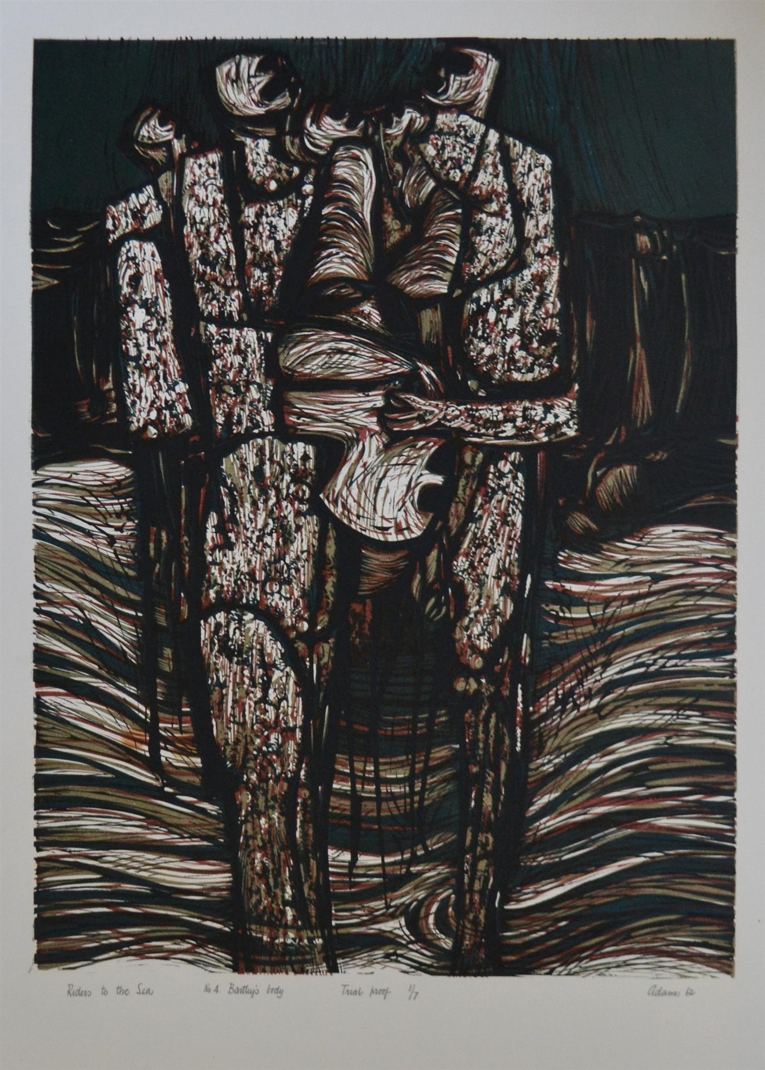 TATE ADAMS, RIDER TO THE SEA NO. 4, BARTLEY'S BODY, SCREENPRINT TRIAL PROOF, 56 X 43CM. CONDITION: OVERALL GOOD, SOME MINOR BROWN STAINING PRESENT INCLUDING ON VERSO, SLIGHLY SHOWING THROUGH TO FRONT OF WORK, LARGEST APPROX 2CM