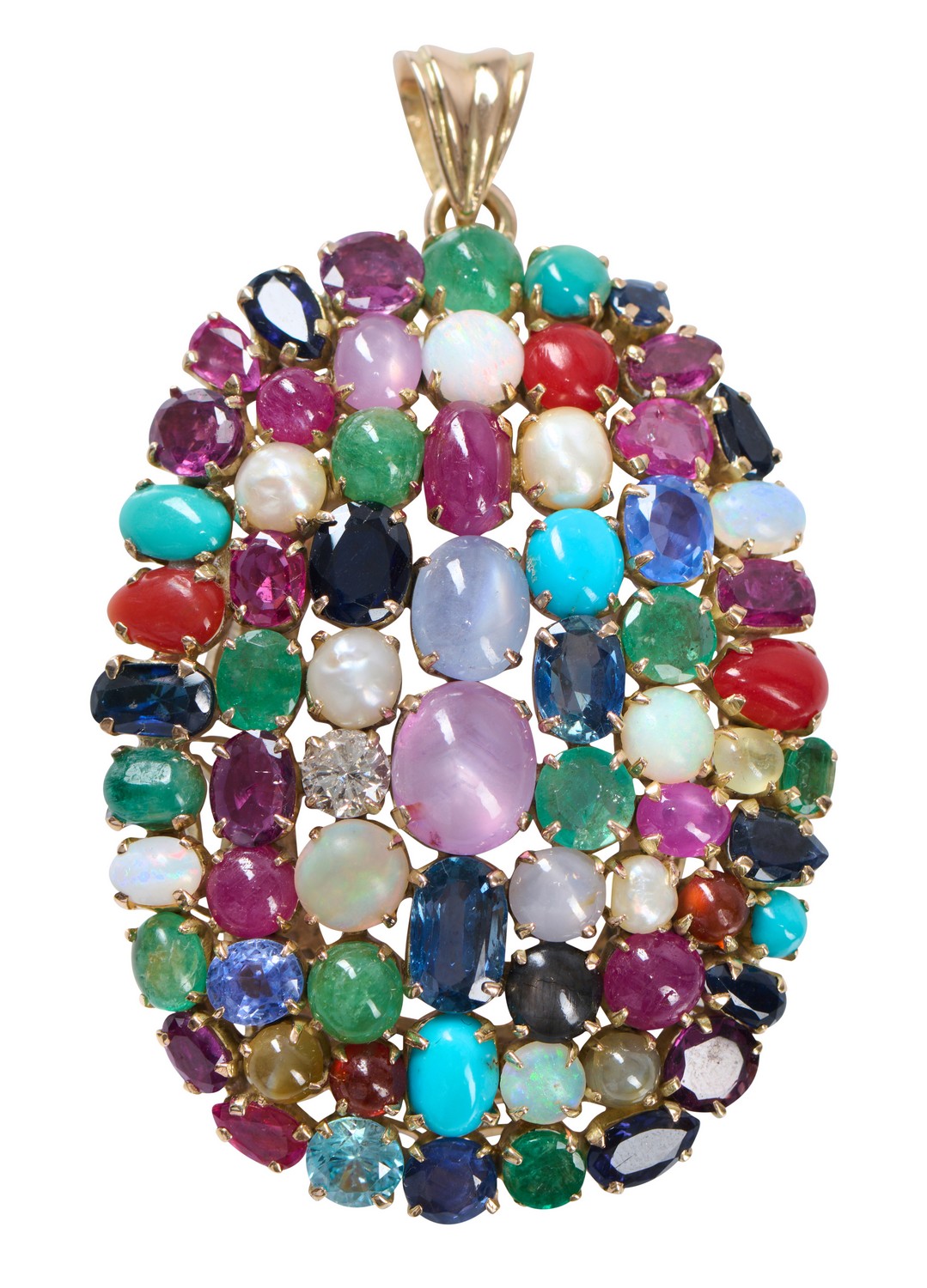 The oval pendant, set with vari-cut gems including, diamond, ruby, emerald, sapphire, coral, opal, zircon, tourmaline, quartz, garnet and pearl, length 50mm.