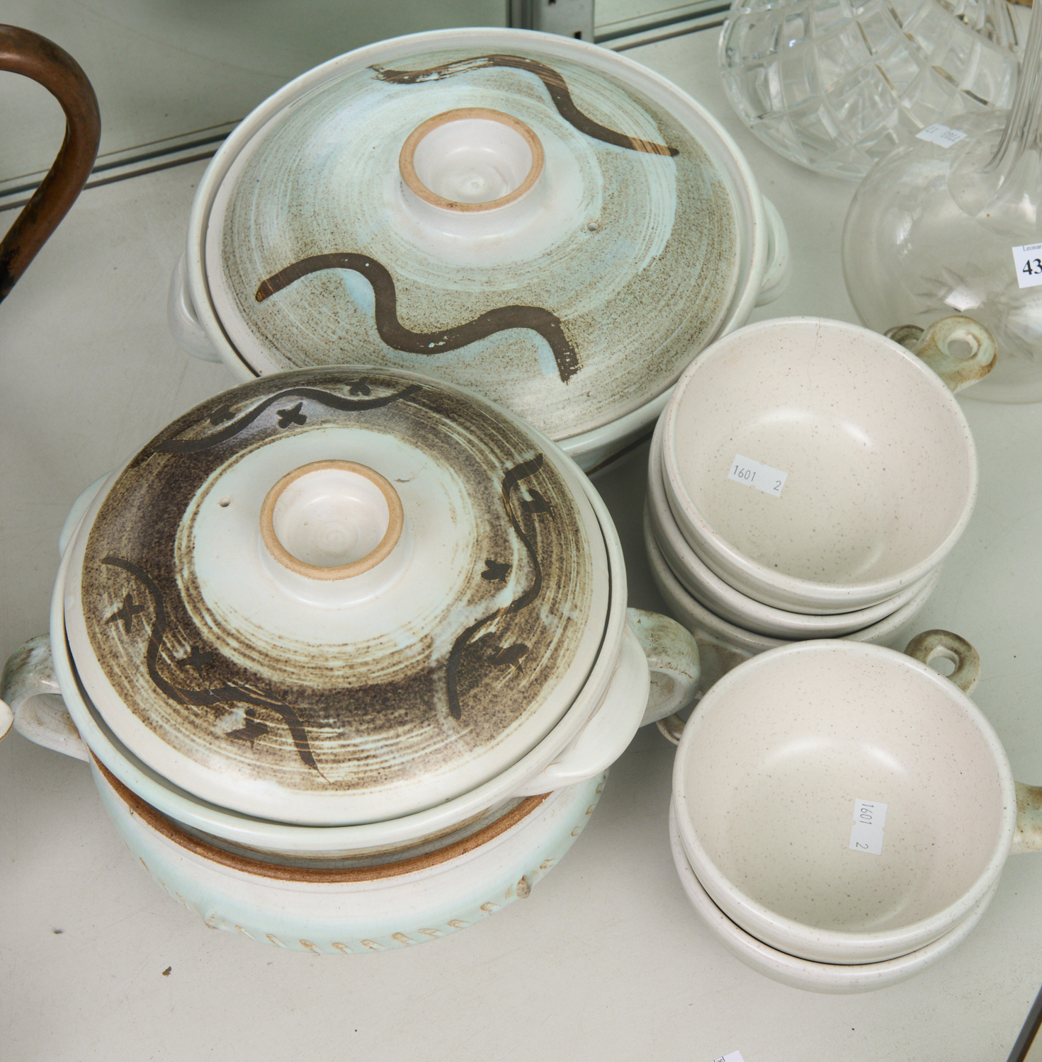 A GROUP OF SYLHA POTTERY COMPRISING TWO LIDDED CASSEROLES, BOWL AND FIVE RAMEKINS, LEONARD JOEL LOCAL DELIVERY SIZE: SMALL