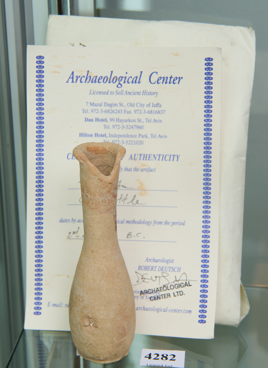 A TERRACOTTA OIL BOTTLE, 2ND-1ST CENTURY BC H.13CM, LEONARD JOEL LOCAL DELIVERY SIZE: SMALL