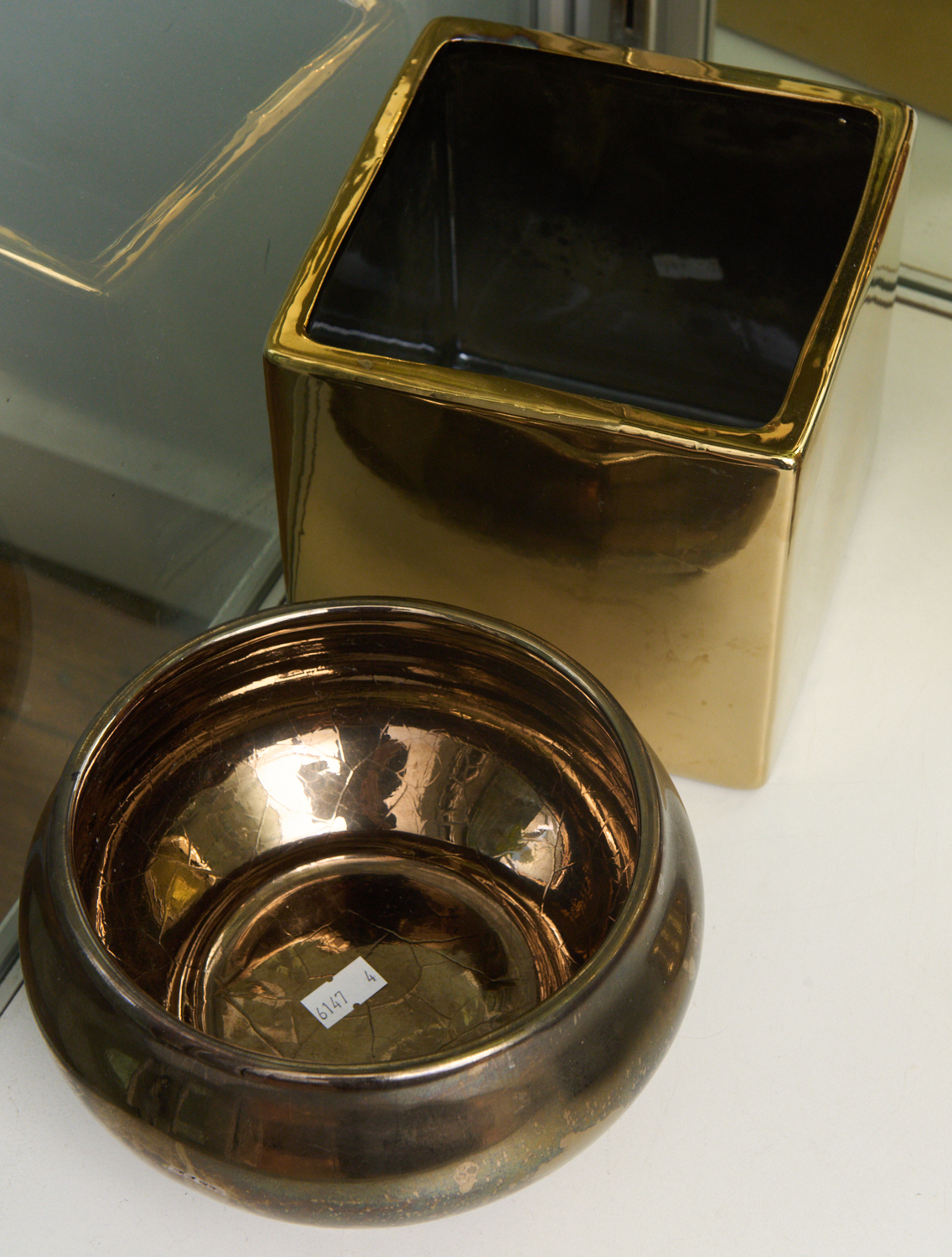 TWO CERAMIC POT PLANT HOLDERS WITH METALLIC LUSTRE GLAZE (15 CM HIGHEST), LEONARD JOEL LOCAL DELIVERY SIZE: SMALL