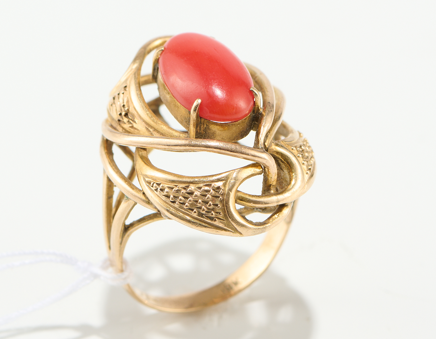 A CORAL SWIRL RING IN 9CT GOLD, RING SIZE L, 8.3GMS