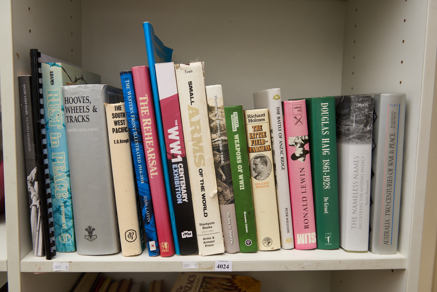 A SHELF OF MILITARY HISTORY INCLUDING ALAN H. SMITH 'GUNNERS IN BORNEA 1962-1966', PETER WILLIAMS 'THE BATTLE OF ANZAC RIDGE', LEONARD JOEL LOCAL DELIVERY SIZE: SMALL