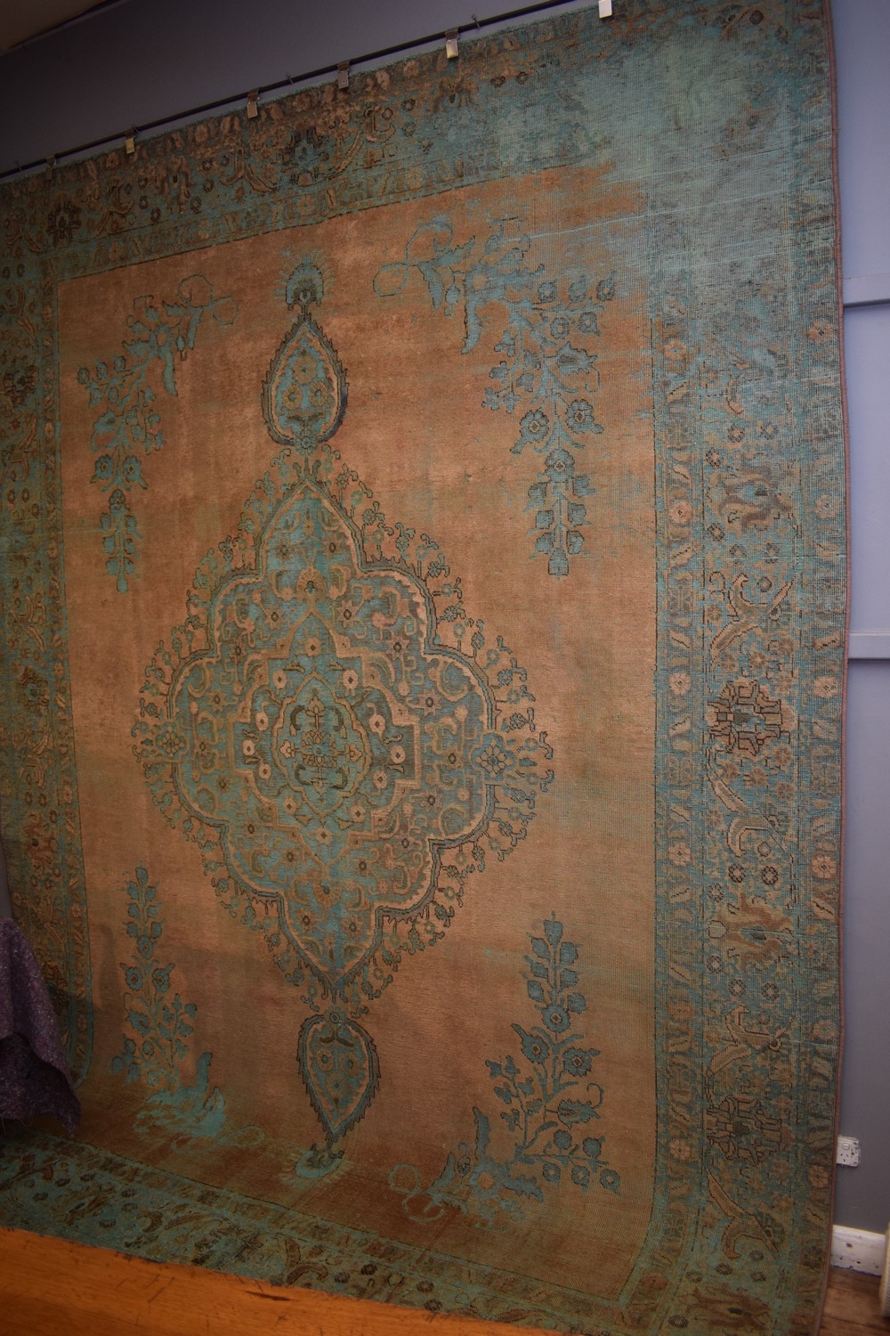 A DECORATIVE MODERN OVER-DYED VINTAGE PERSIAN TABRIZ CARPET, SHORN PILE. A UNIQUE CONTEMPORARY CARPET CREATED FROM A VINTAGE HAND-KNOTTED PERSIAN TABRIZ CARPET, WITH A BEAUTIFUL MEDALLION & CORNER MEDALLIONS. OVER-DYED IN TONES OF TURQUOISE & TAN. AS SEEN IN BELLE & HOME DÉCOR MAGAZINES. SIZE: 385X289CM ORIGIN: PERSIA - RRP: $8,900