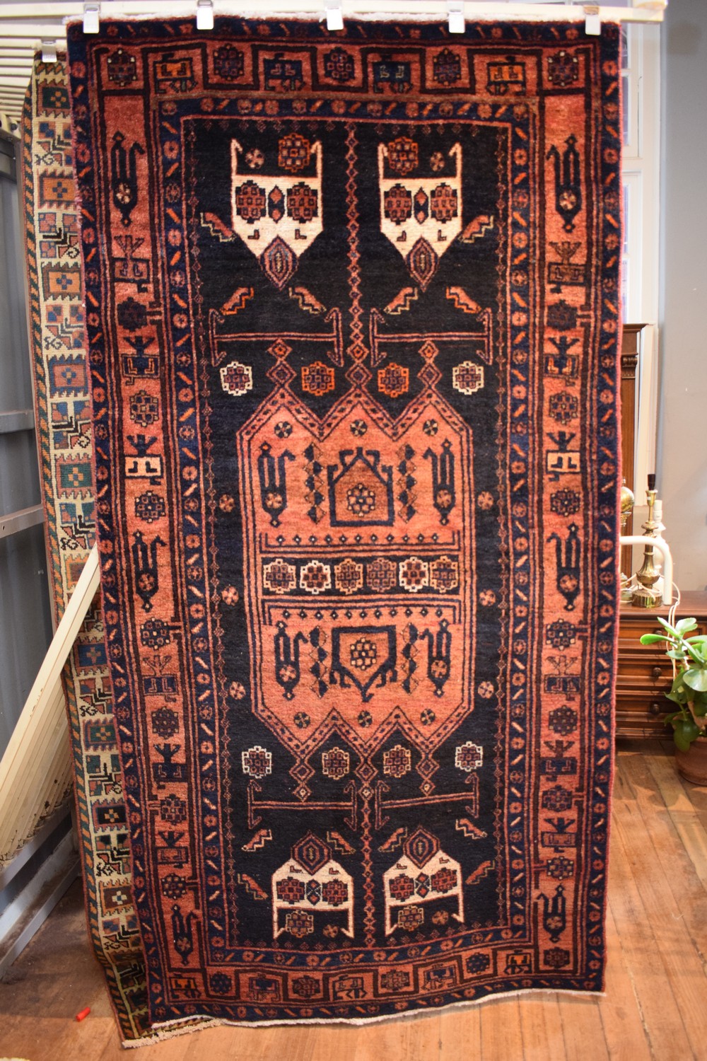 A CIRCA 1970s TRIBAL PERSIAN SHAHSAVAN RUG. 100% WOOL. NATURAL DYES. HAND-KNOTTED & WITH TRIBAL TABLE SPREAD DESIGN WITH COVERED DISHES & PITCHERS SET AGAINST GEOMETRIC PATTERNS. BORDER OF TRIBAL & ROSETTES. IN GOOD CLEAN CONDITION. CERTIFICATE OF AUTHENTICITY INCLUDED. SIZE: 246X125CM ORIGIN: PERSIA - RRP: $2,200