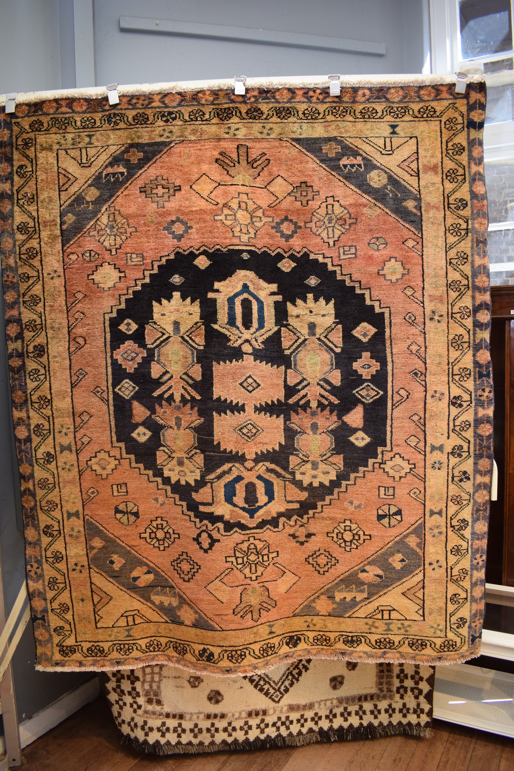 A PERSIAN NOMADIC LURI. 100% WOOL AND NATURAL DYES. VINTAGE PILE, HAND KNOTTED NOMADIC WEAVE WITH TRADITIONAL TRIBAL MEDALLION CONTAINING TRIBAL MOTIFS ON A CHARCOAL FIELD. ALL OVER TRIBAL MOTIFS ON A BURNT ORANGE FIELD. CERTIFICATE OF AUTHENTICITY INCLUDED. SIZE: 195X166CM ORIGIN: PERSIA - RRP: $2,400