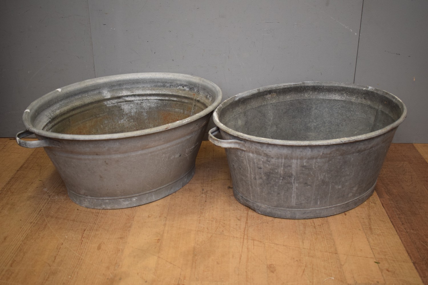 TWO LARGE FRENCH GALVONISED OVAL BATHS / TUBS WITH ORIGINAL HANDLES ( 32H X 83W X 62D CM) (LEONARD JOEL DELIVERY SIZE: LARGE)