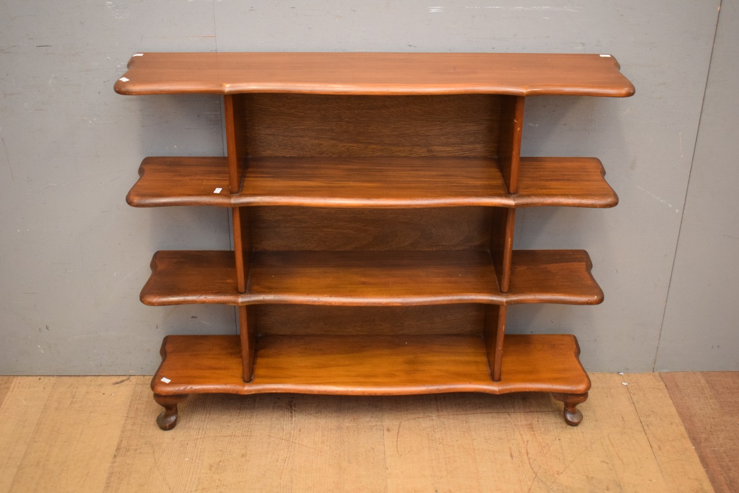 A VINTAGE MYRTLEWOOD THREE TIER BOOKSHELF (A/F) (H90 X W108 X D22 CM) (LEONARD JOEL DELIVERY SIZE: LARGE)