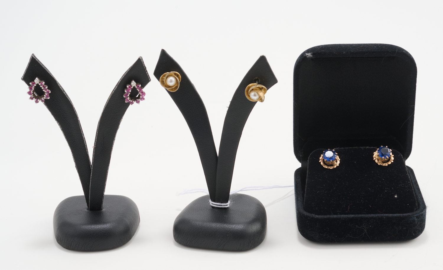THREE PAIRS OF GOLD AND GEM-SET EARRINGS