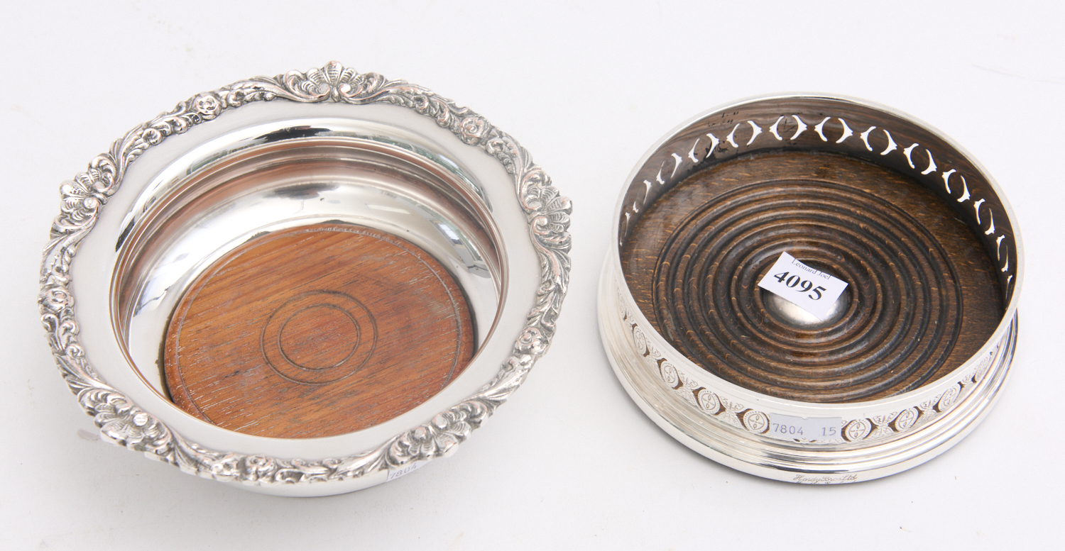 TWO LATE 19TH CENTURY SILVER PLATE AND WOODEN BASED BOTTLE COASTERS DIA.17CM, LEONARD JOEL LOCAL DELIVERY SIZE: SMALL