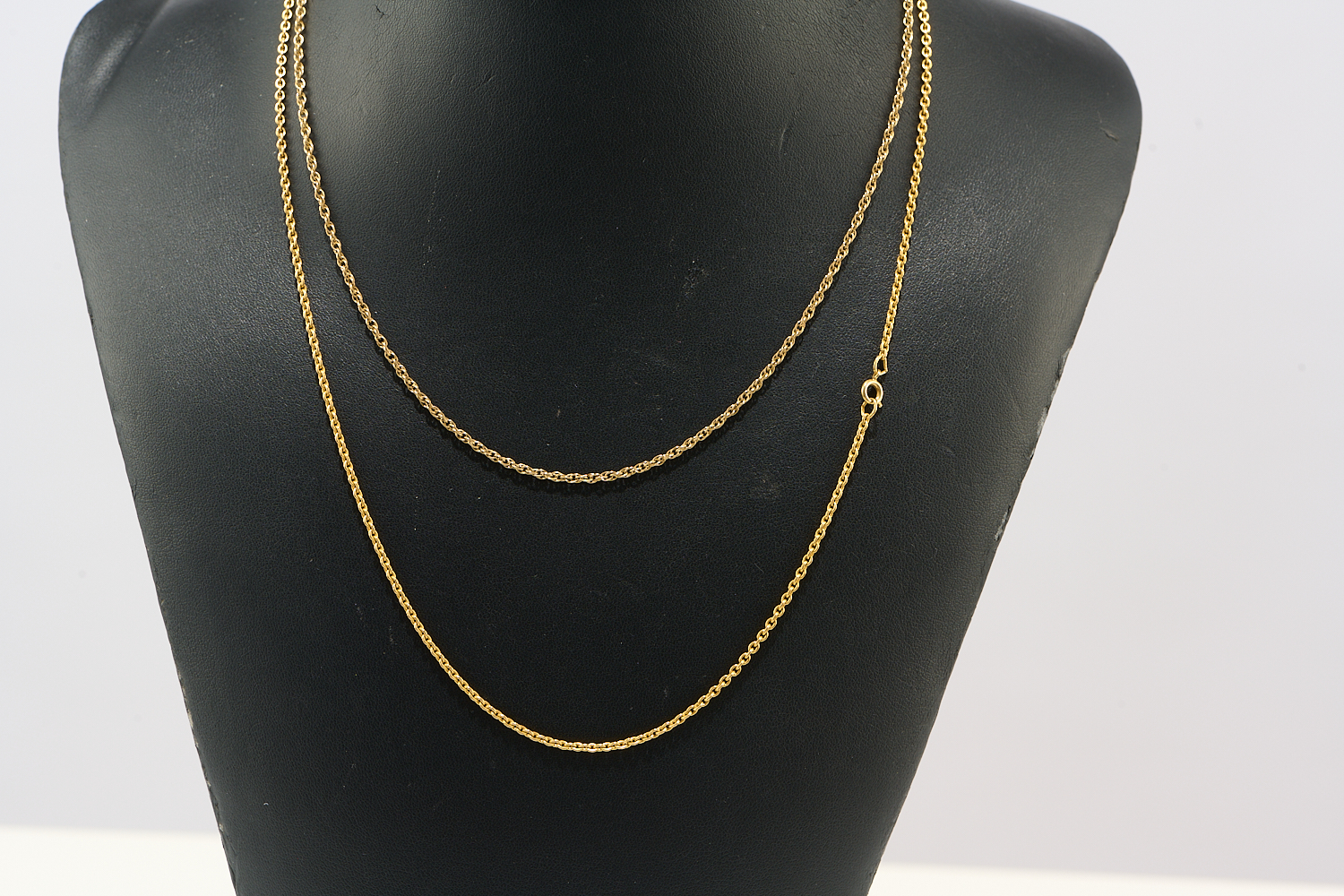 TWO NECKLACES ONE IN 9CT GOLD, LENGTH 440MM, 3.1GMS. ONE GOLD PLATED, 540MM