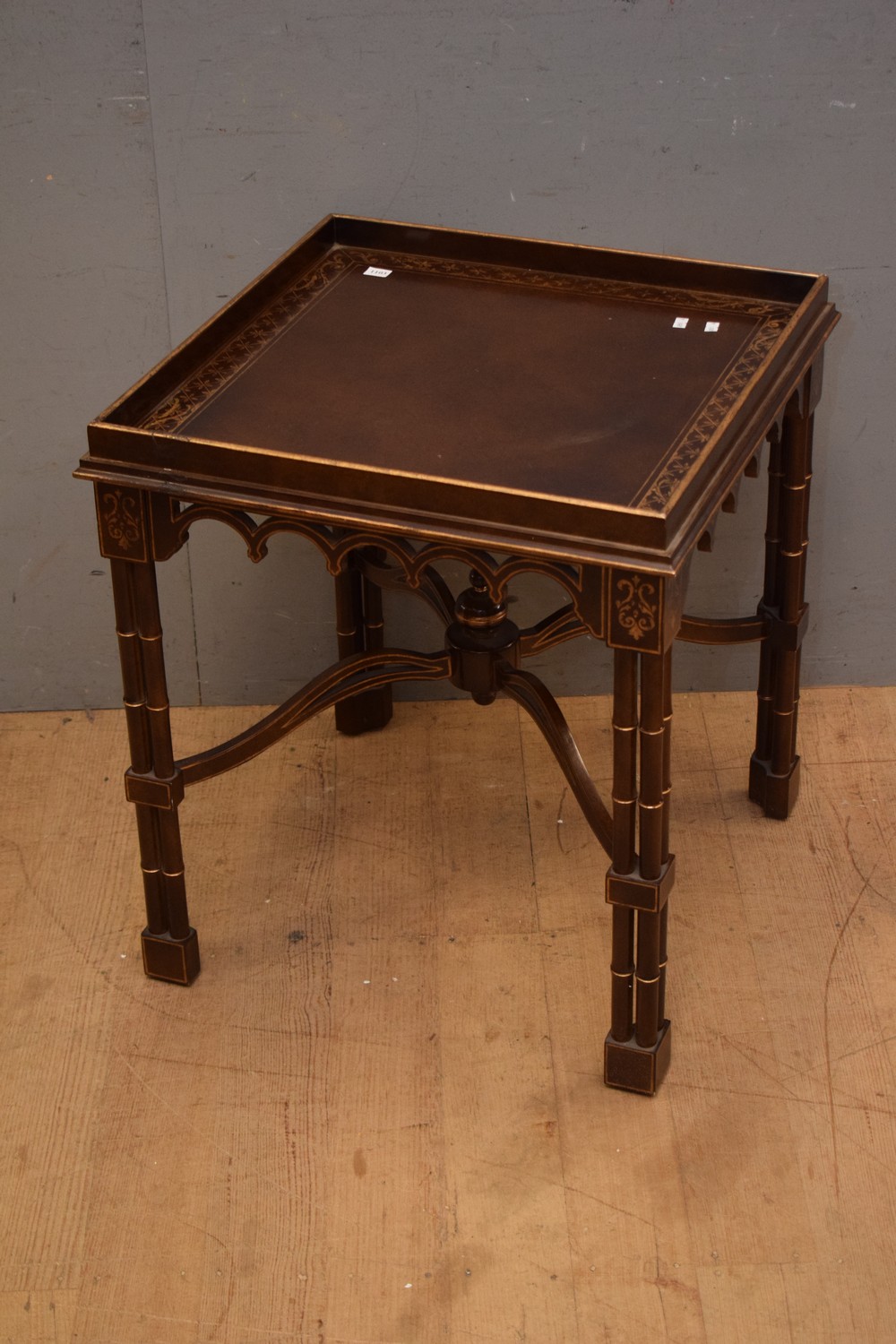 A DECORATIVE LAMP TABLE WITH CROSS BASE AND GILT DETAILING (H63 X W57 X D57 CM) (LEONARD JOEL DELIVERY SIZE: LARGE)