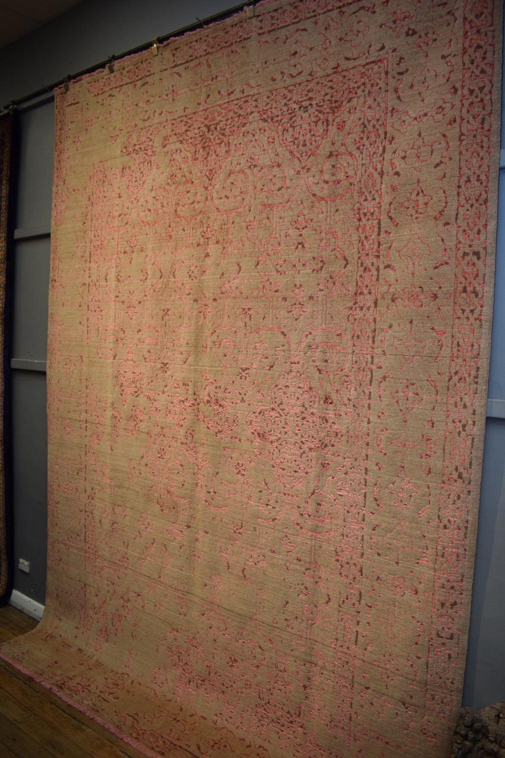 A BRAND-NEW PERSIAN TABRIZ TRANSITIONAL RUG. FINELY HAND-LOOMED WITH MODERN TRANSITIONAL VINTAGE STYLE DESIGN. PLUSH WOOL PILE. THE ENTIRE IN CORAL PINK, BEIGE & BROWN TONES. WOOL & SILKY TEXTURE. SIZE: 350X250CM ORIGIN: IRAN- RRP: $7,900 CERTIFICATE OF AUTHENTICITY INCLUDED