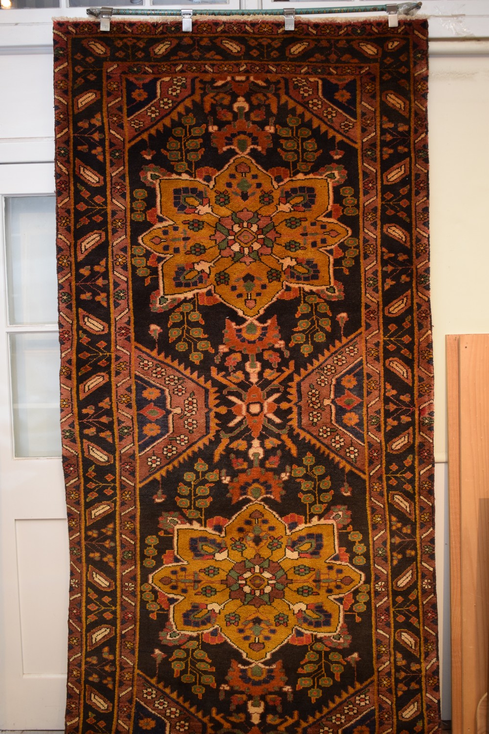 A MAGNIFICENT SOLID & DURABLE PERSIAN HERIZ HALL RUNNER. 100% WOOL PILE. NATURAL DYES. HAND-WOVEN IN THE VILLAGES OF THE HERIZ REGION NORTH WEST OF IRAN, AN IMPORTANT CARPET-PRODUCING REGION OF IRAN WITH TRADITIONAL DESIGN OF BOLD DOMINANT FLORAL MEDALLIONS & QUARTERED CORNER MEDALLIONS IN A FIELD OF PLUM BLOSSOM MOTIF & OAK LEAVES. WIDE BORDER OF LEAF & FLORAL SPRAYS PATTERNS. EX-GALLERY DISPLAYED CARPET. IN EXCELLENT CONDITION. CERTIFICATE OF AUTHENTICITY INCLUDED. SIZE: 400X137CM ORIGIN: PERSIA - RRP: $4,400