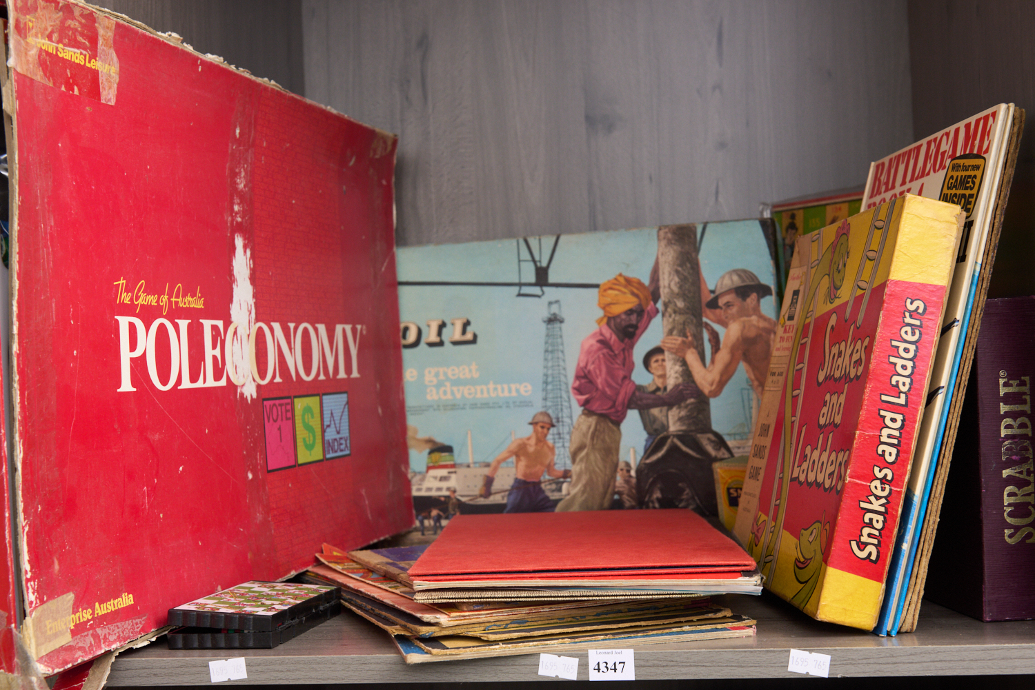 A SHELF OF VINTAGE BOARD GAMES, LEONARD JOEL LOCAL DELIVERY SIZE: SMALL. The Rodney Permezel Collection