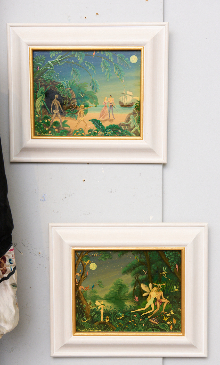 TWO VINTAGE OIL ON BOARD MINIATURE PAINTINGS DEPICTING WILLIAM SHAKESPEARE A MID SUMMER NIGHTS DREAM SCENES BY SYDNEY ARTIST RONALD CHAMBERS W.36CM X 30CM, LEONARD JOEL LOCAL DELIVERY SIZE: SMALL