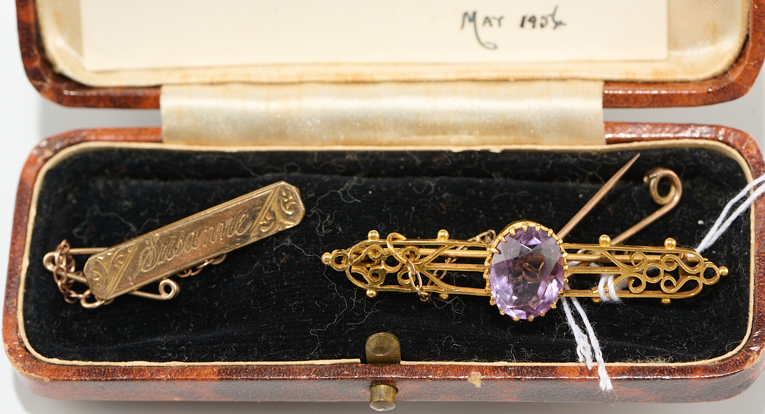 TWO VINTAGE BROOCHES, INCLUDING AN AMETHYST BAR BROOCH IN 9CT GOLD AND A GOLD LINED BROOCH ENGRAVED 'SUZANNE'