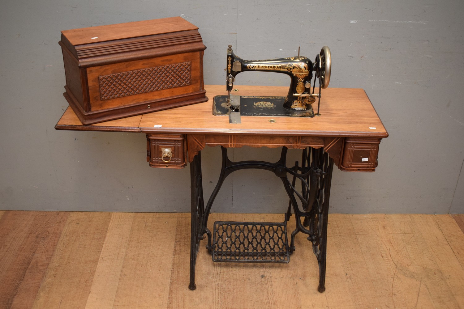 A BEAUTIFULLY RESTORED TIMBER & CAST IRON SEWING TABLE WITH LID (A/F) (98H x 117W x 42D CM) (PLEASE NOTE THIS HEAVY ITEM MUST BE REMOVED BY CARRIERS AT THE CUSTOMER'S EXPENSE. LEONARD JOEL STAFF CANNOT ASSIST CARRYING THIS ITEM) (X-LARGE ITEM)