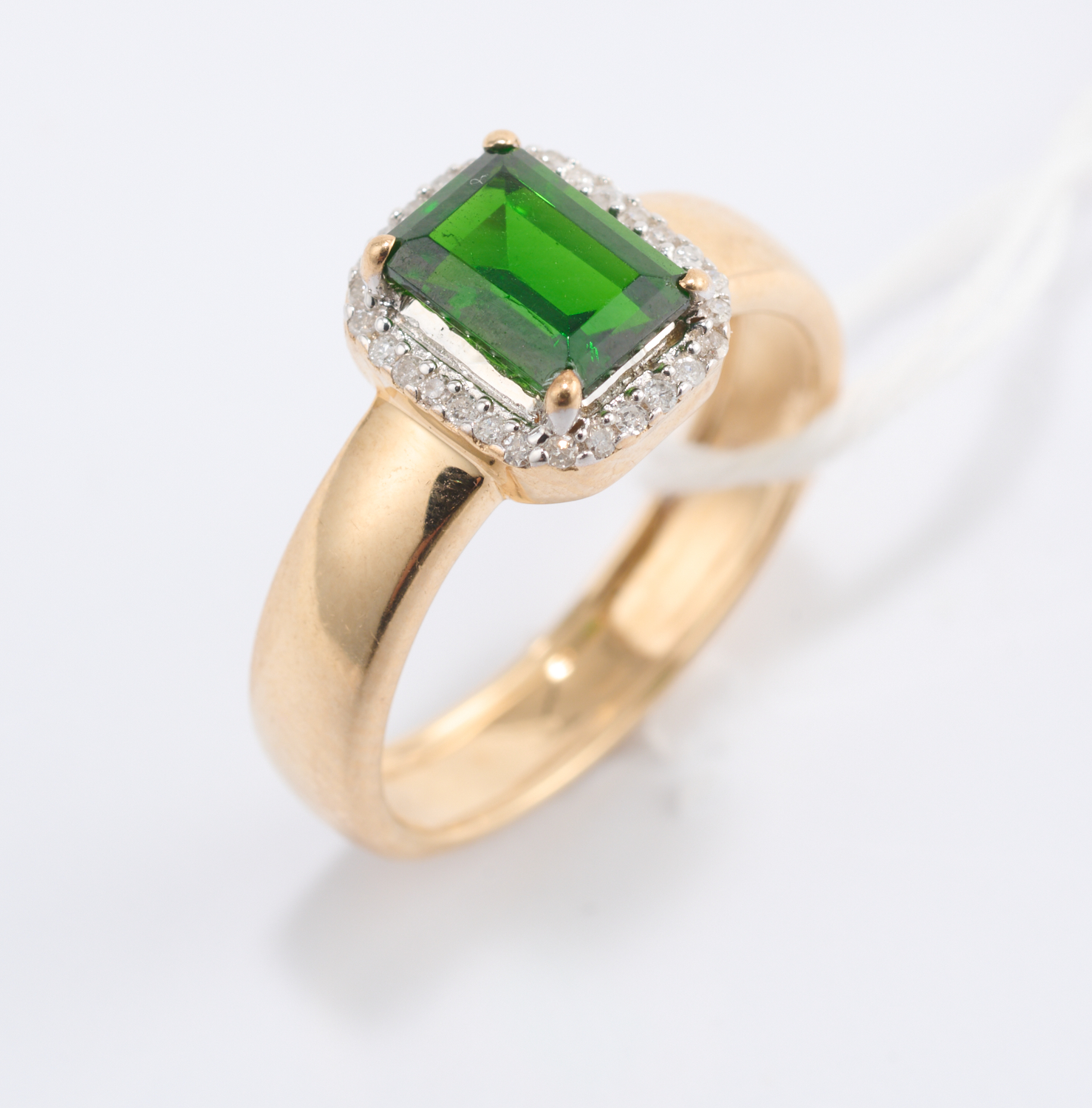 A CHROME DIOPSIDE AND DIAMOND CLUSTER RING IN 9CT, RING SIZE N, 3.0GMS