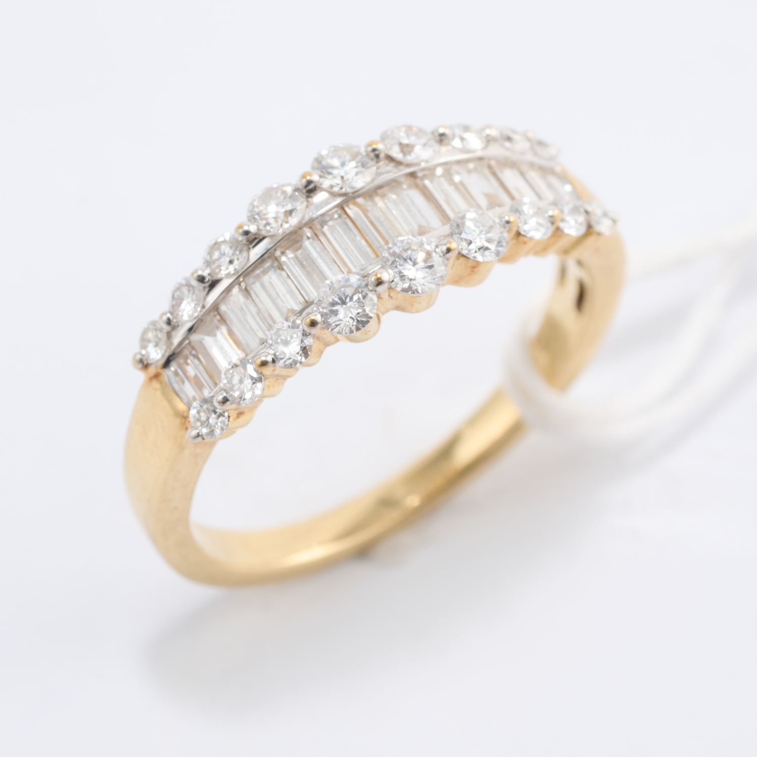 A ROUND BRILLIANT AND BAGUETTE CUT DIAMOND RING IN 9CT GOLD, RING SIZE N, 2.8GMS