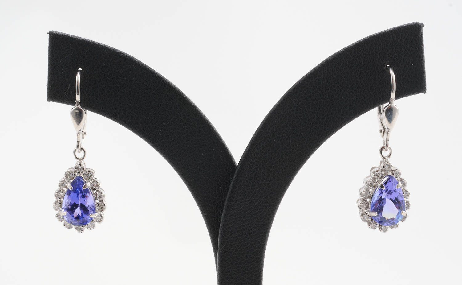 A PAIR OF DIAMOND AND TANZANITE EARRINGS IN 18CT WHITE GOLD, TANZANITE TOTALLING 3.85ct, 4.3GMS