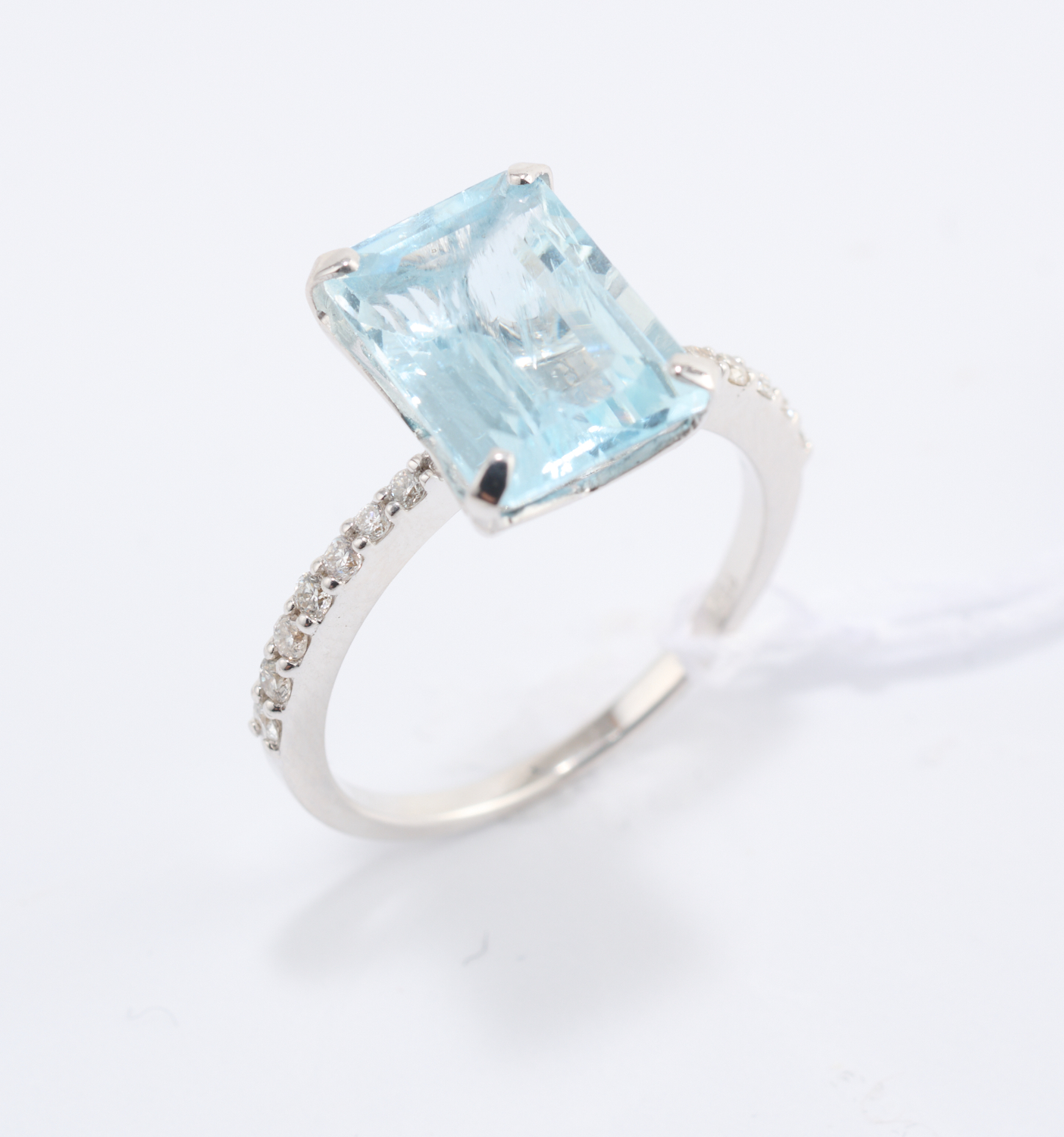 AN AQUAMARINE AND DIAMOND RING IN 18CT WHITE GOLD, THE AQUAMARINE WEIGHING 3.80CTS, RING SIZE O