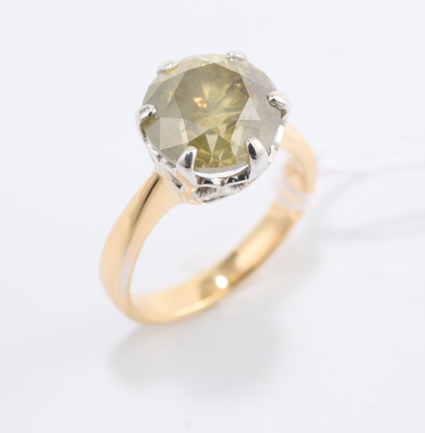 A YELLOW DIAMOND RING IN TWO TONE 18CT GOLD, THE DIAMOND TOTALLING 5.01CTS, RING SIZE N, WITH VALUATION, 5.6GMS