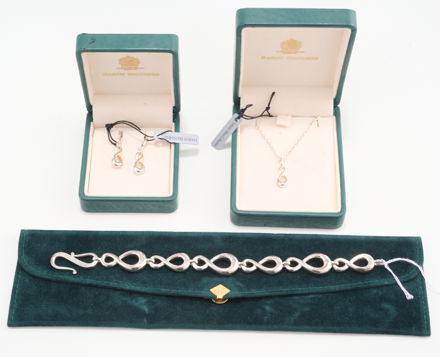 A SILVER JEWELLERY SUITE BY HARDY BROTHERS, INCLUDING A BRACELET, EARRINGS AND PENDANT