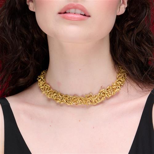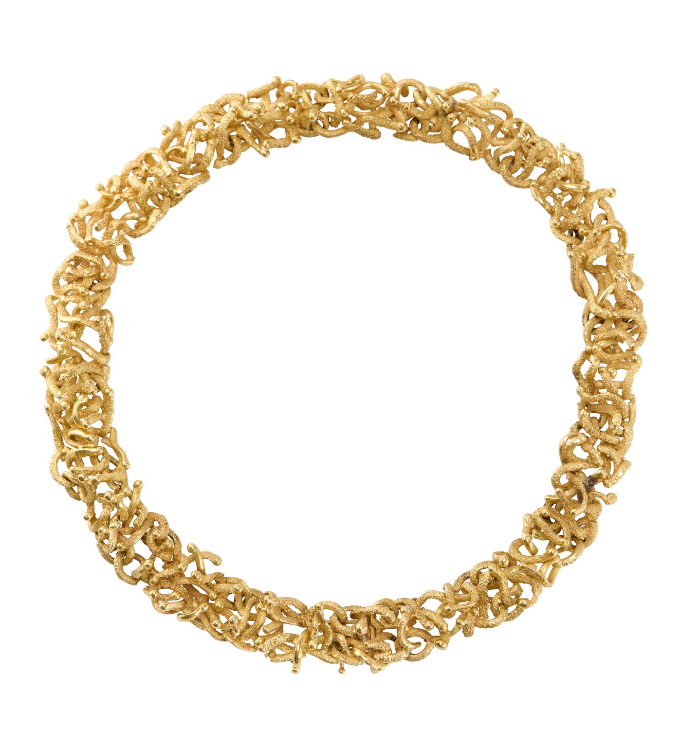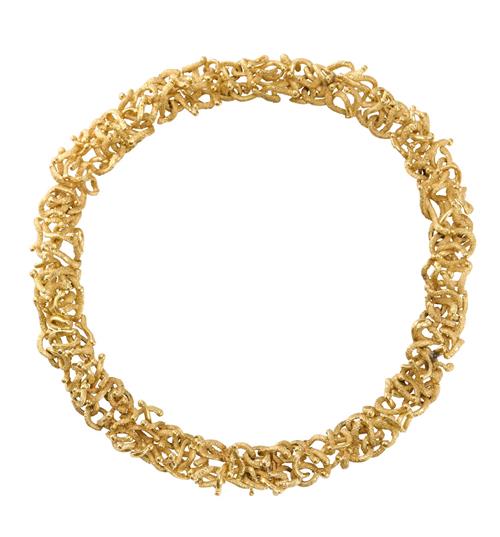 Of abstract design, composed as a series of interlocking textured bark finish and polished gold links, inner circumference approximately 340mm.