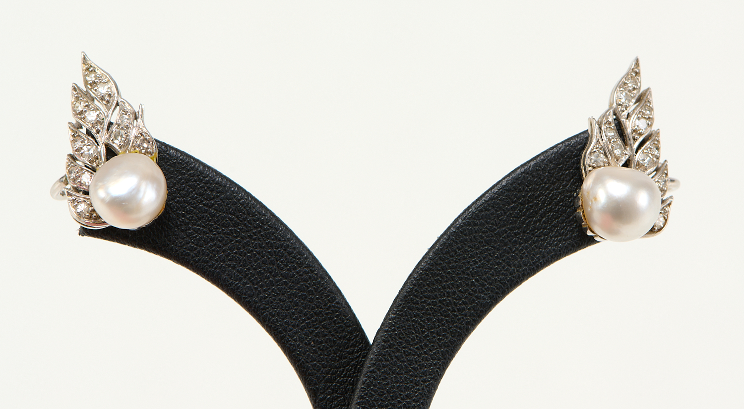 A PAIR OF VINTAGE PEARL AND DIAMOND SET EARRINGS IN PLATINUM, TO SCREW BACK FITTINGS IN 18CT WHITE GOLD, TOTAL WEIGHT 6.1GMS