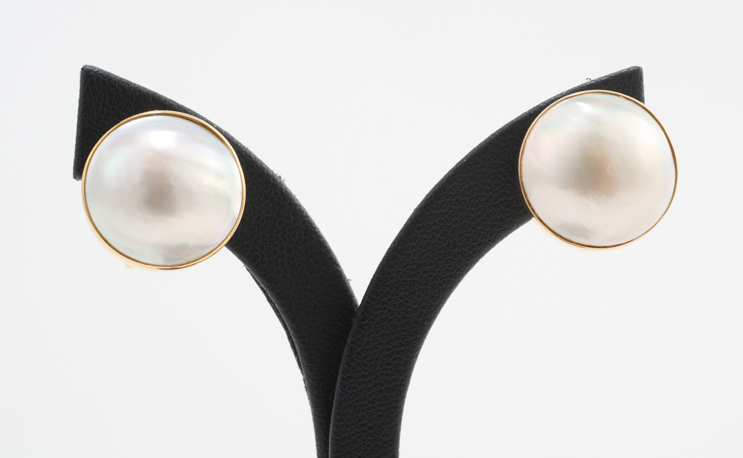 A PAIR OF MABE PEARL EARRINGS IN 14CT GOLD, TO CLIP FITTINGS, MEASURING 1.8CM DIAMETER, TOTAL WEIGHT 10.4GMS