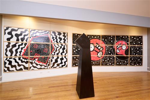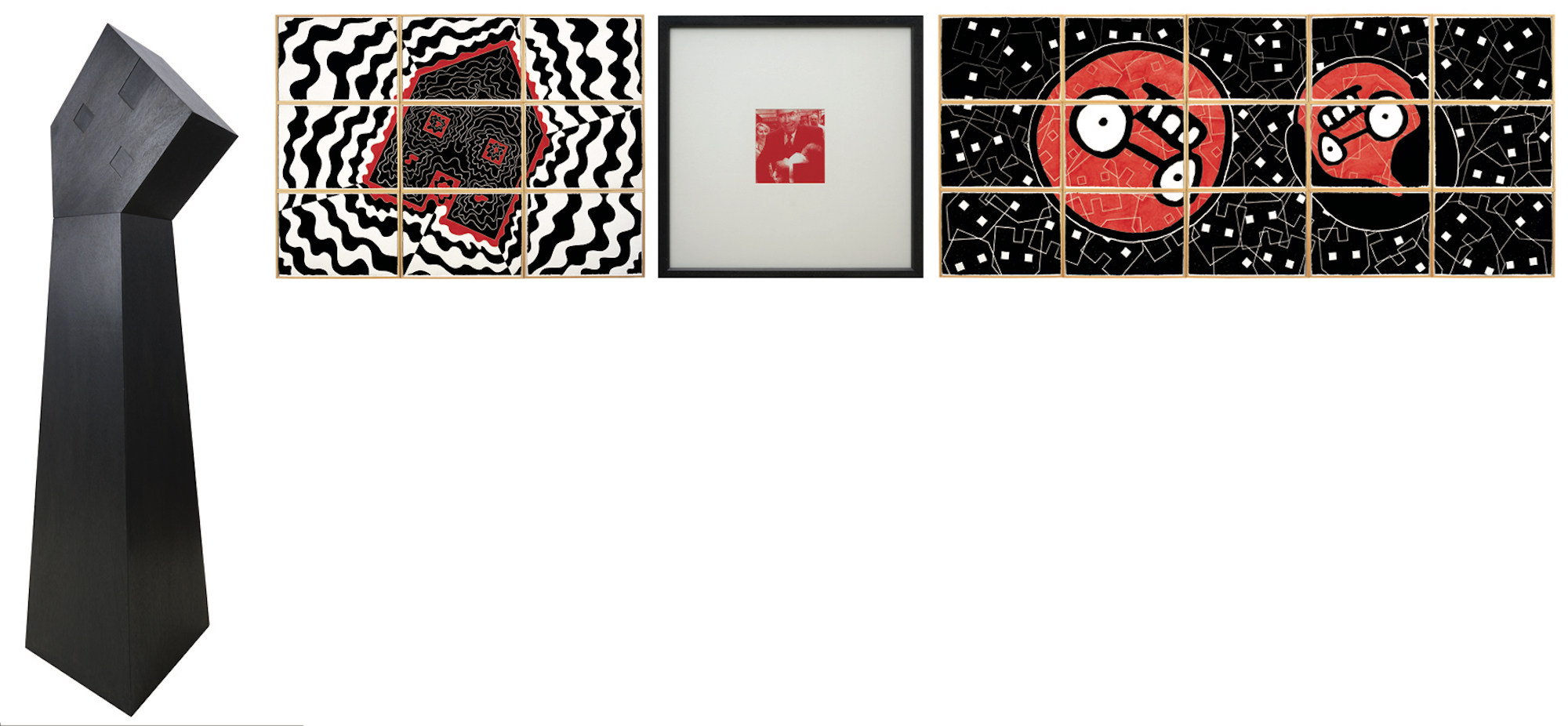 ink and pencil on paper (9) and (15), accompanying screenprint, and plywood sculpture