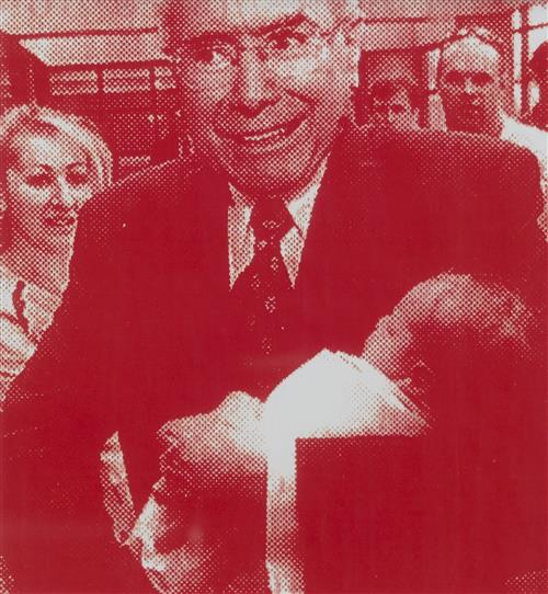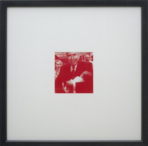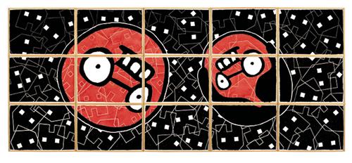 The red face is also a recurring motif in Danko's work. First appearing in his work Taste in 1988, the face was originally inspired by William Hogarth's Plate 1, 'The Sculptors Yard', from the book The Analysis of Beauty, 1753. In the image, bottom right, we find Hogarth's childish face that Danko now appropriates within his works as the brainless, disembodied head of the village idiot. He especially utilises the face to signify a mindlessness, often grouped together to resemble the ignorant mob and conformity of the crowd.