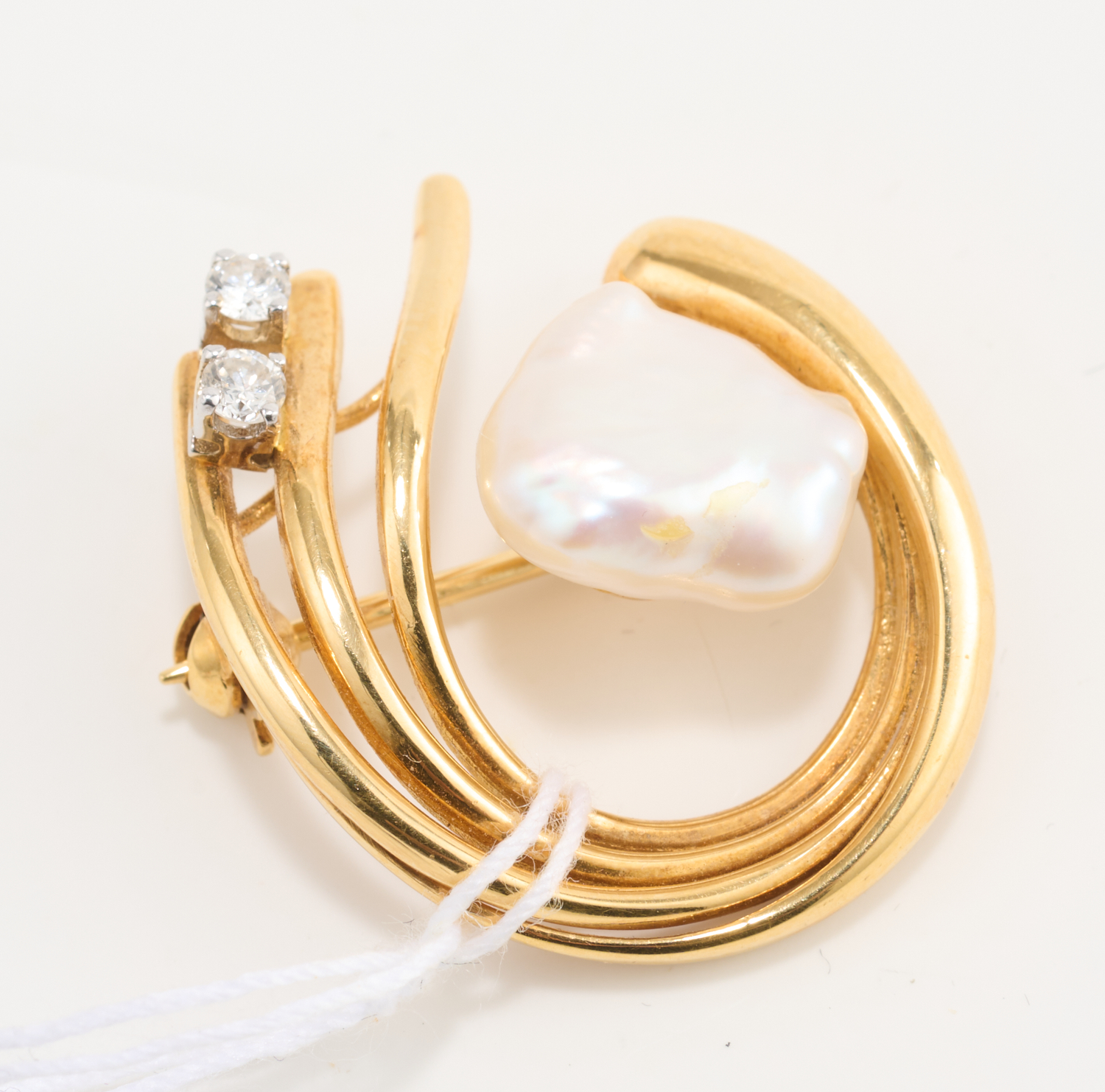 A PEARL AND DIAMOND BROOCH IN 18CT GOLD, 5.3GMS