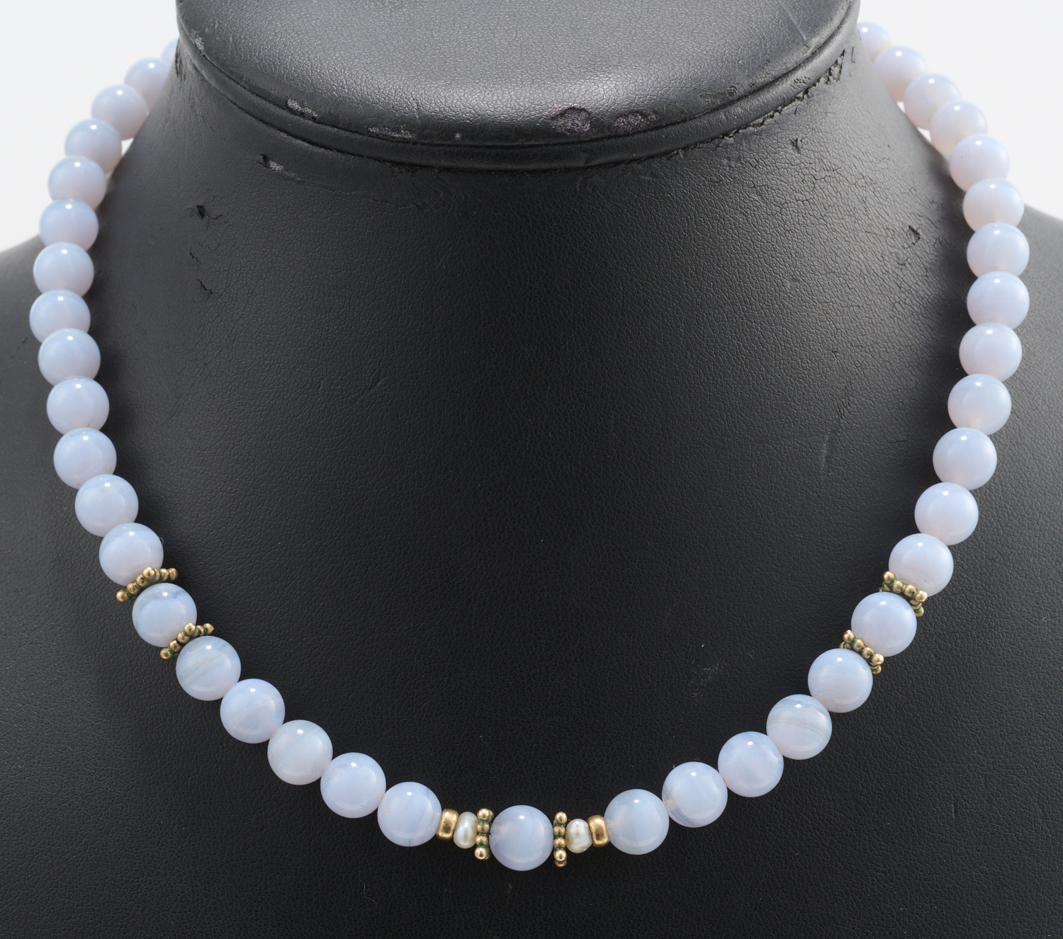 A BLUE LACE AGATE BEAD, PEARL AND SILT BEAD NECKLACE BY VICTORIA LOUISE, RETAILED BY MAKER'S MARK