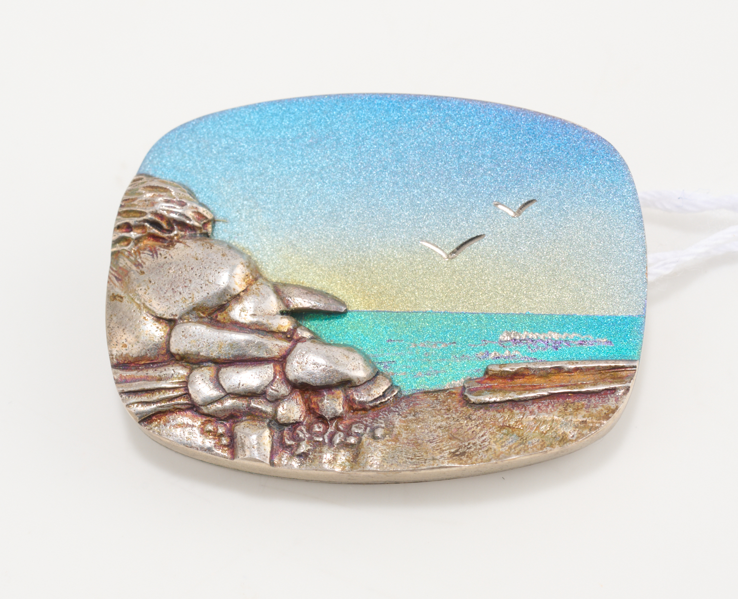 AN AUSTRALIAN LANDSCAPE BROOCH IN STERLING SILVER BY TONY KEAN, RETAILED BY MAKER'S MARK