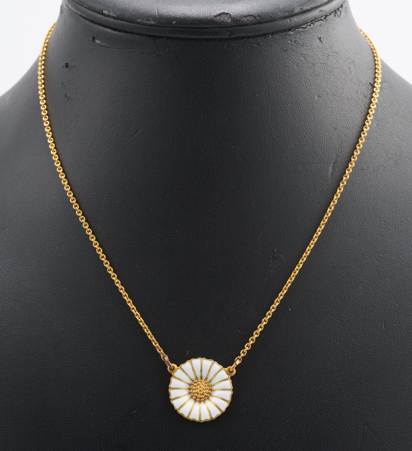 AN ENAMEL DAISY PENDANT NECKLACE BY GEORG JENSEN IN GOLD PLATED STERLING SILVER, BOXED